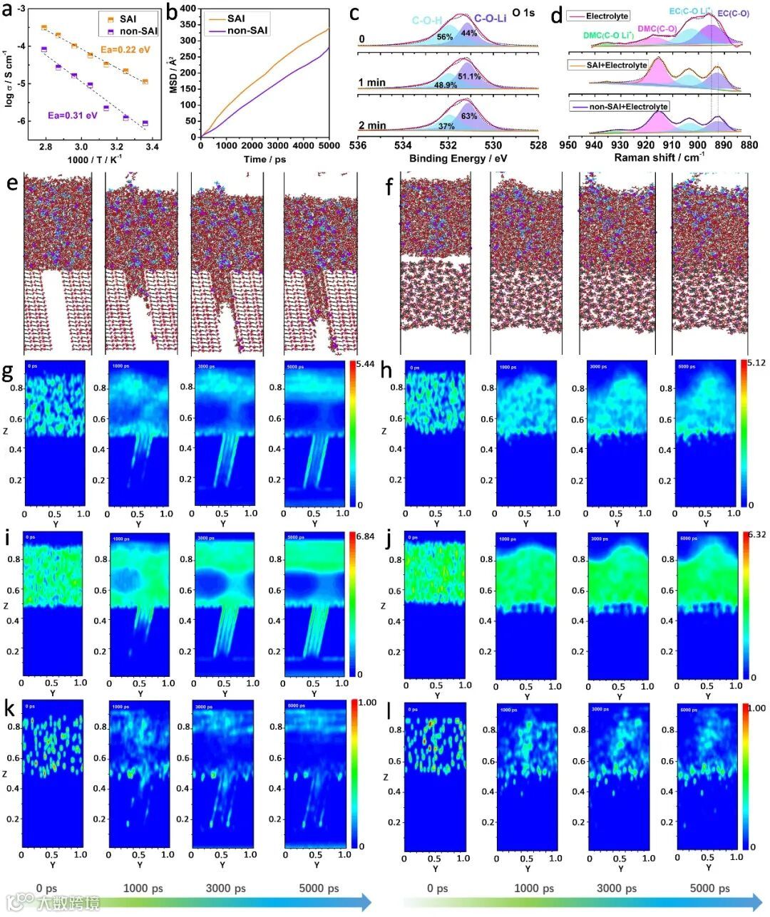 图3. (a)SAI和non-SAI不同温度下的离子电导率;(b)锂离子在SAI和non-SAI中的MSD;(c)SAI和non-SAI中O 1s的XPS谱图;(d)SAI和non-SAI 的去溶剂化作用;(e, f)SAI和non-SAI中锂离子传输的分子动力学模拟;(g~l)模拟过程中SAI和non-SAI中EC(g, h)、DMC(i, g)和锂离子(k, l)的2D分布图。