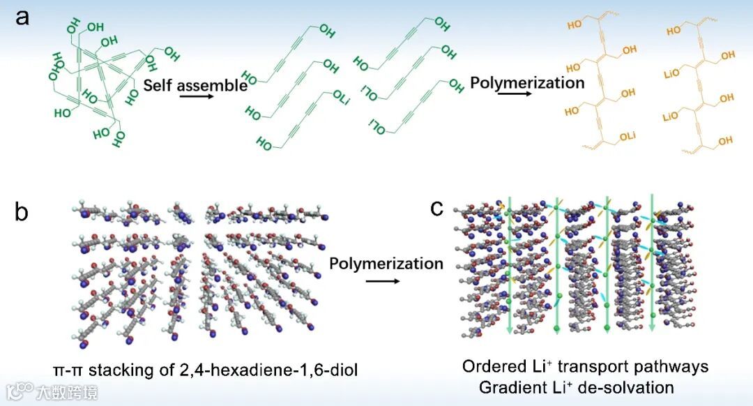 图1. 自组装锂离子传导层(SAI)的合成过程(a); SAI中有序锂离子传输通道和梯度去溶剂化作用示意图(b)。