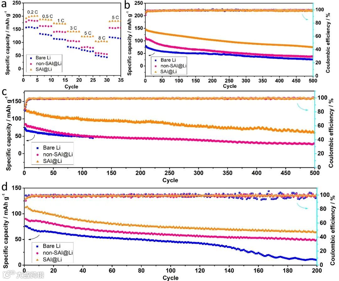 有序的锂离子传输通道和有效的梯度去溶剂化作用,加速了锂离子的传导并促进了锂离子在锂金属表面的均匀沉积。由SAI修饰的锂金属负极(SAI@Li)组装的对称电池在不同电流密度条件下均表现出显著延长的循环寿命,即使在高电流密度(3 mA cm-2~1 mAh cm-2和6 mA cm-2~1 mAh cm-2)条件下,仍具有优于纯锂金属负极(Bare Li)和non-SAI修饰的锂金属负极(non-SAI@Li)组装的对称电池的循环稳定性。由SAI@Li和NCM811组装的锂金属电池也表现出显著提升的倍率性能,在8 C的条件下,仍具有105 mAh g-1的放电比容量。此外,在3 C和 5 C的快速充放电条件下,SAI对于锂金属负极的修饰也使得全电池的放电比容量和循环稳定性得到了明显提升。