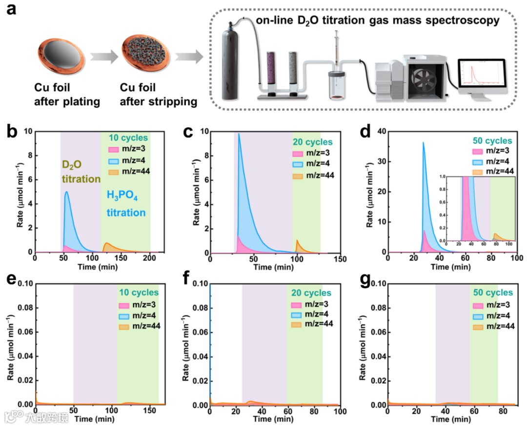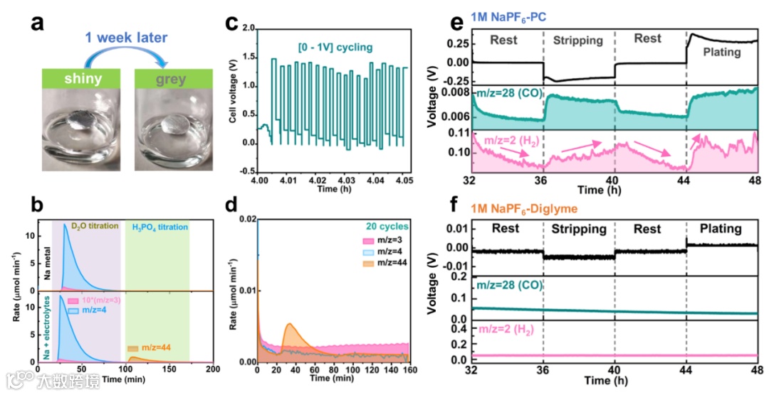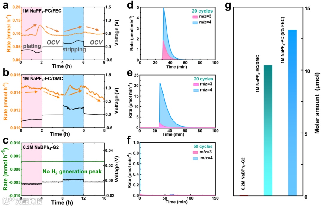 图3. 差分电化学质谱(DEMS)研究钠金属电池中析氢和NaH形成的关系。
