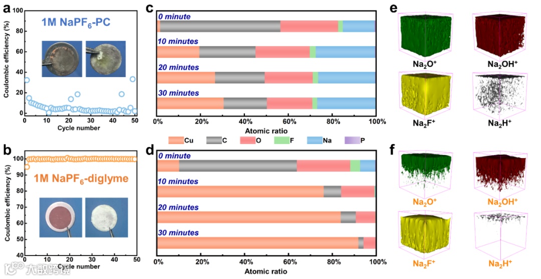 首先研究了酯类电解质和醚类电解质中钠沉积和剥离过程的电化学性能差异,酯类电解液中钠铜电池首圈库仑效率低于40%,平均库伦效率低于20%,相比之下,醚类电极液中钠铜电池首圈库伦效率高于90%,接下循环的库伦效率接近100%。使用XPS深度剖析循环后的钠负极表面不同深度SEI组成的化学变化,在酯类电解液中循环后的钠负极表面比醚类电解液中具有更多的Na和有机物种,表明更严重的碳酸酯电解液的分解并伴随着活性钠的消耗。由于XPS无法检测氢元素,随后通过3D ToF-SIMS检测到酯类电解液中循环后的钠金属负极存在大量的NaH组分。