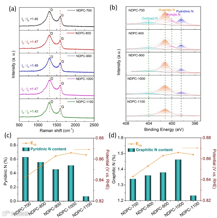 图5 NDPC-X的拉曼、XPS测试及与氮的类型与活性相关图。
