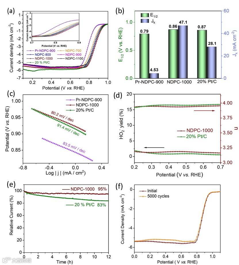 在0.1 M KOH电解液中测试NDPC-X ORR活性。其中,最优的NDPC-1000半波电位达到0.87 V vs. RHE。连续12小时后获得95%的电流保持率,在0.6 V–1.0 V的电势范围内进行5000次电势循环后,半波电位有微小(~7 mV)的衰减。这一结果表明NDPC-1000具有优异的稳定性。