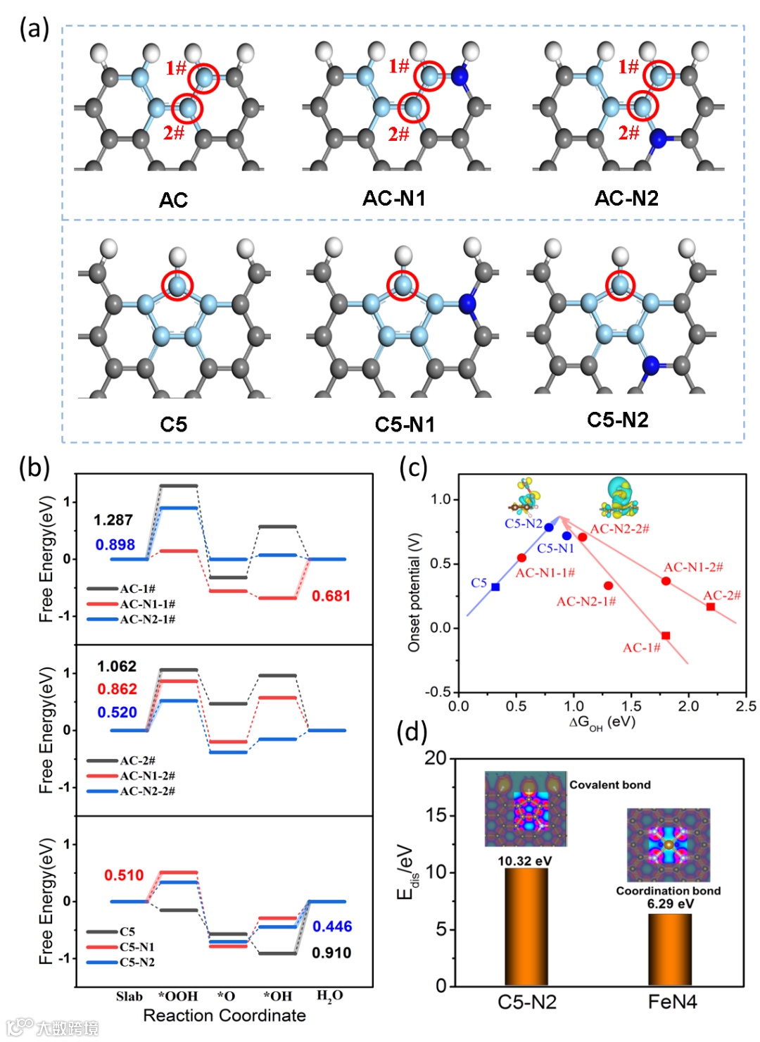 图2 理论搭建构型、ORR的自由能图、OH吉布斯自由能(∆GOH)和起始电位的火山图及解离能。