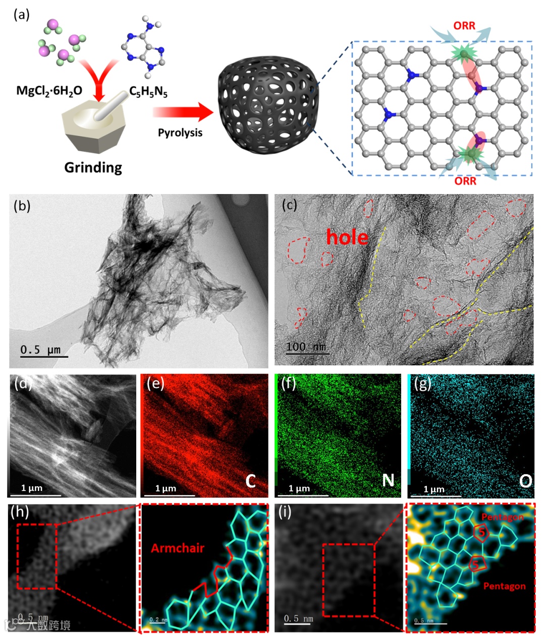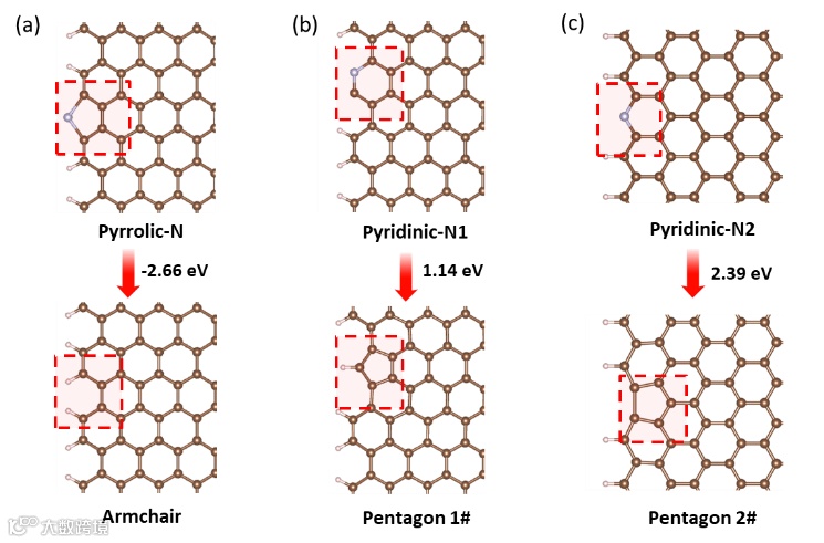 高温碳化过程中不稳定的吡咯N(Pr-N)和吡啶N(Pd-N)流失可产生扶手(armchair,AC)、五边形(pentagon,C5)三种缺陷类型(图1)。与Pentagon 2#相比,armchair和Pentagon 1#缺陷更容易产生,因为它们的形成能较小。我们构建了六个具有九个活性位点的模型,分别研究石墨氮(G-N)与AC和C5缺陷的协同效应。结构表明,G-N通过增强AC缺陷吸附强度提高ORR活性,而通过电子供给促进强吸电子C5物种的中间解吸以提高活性。