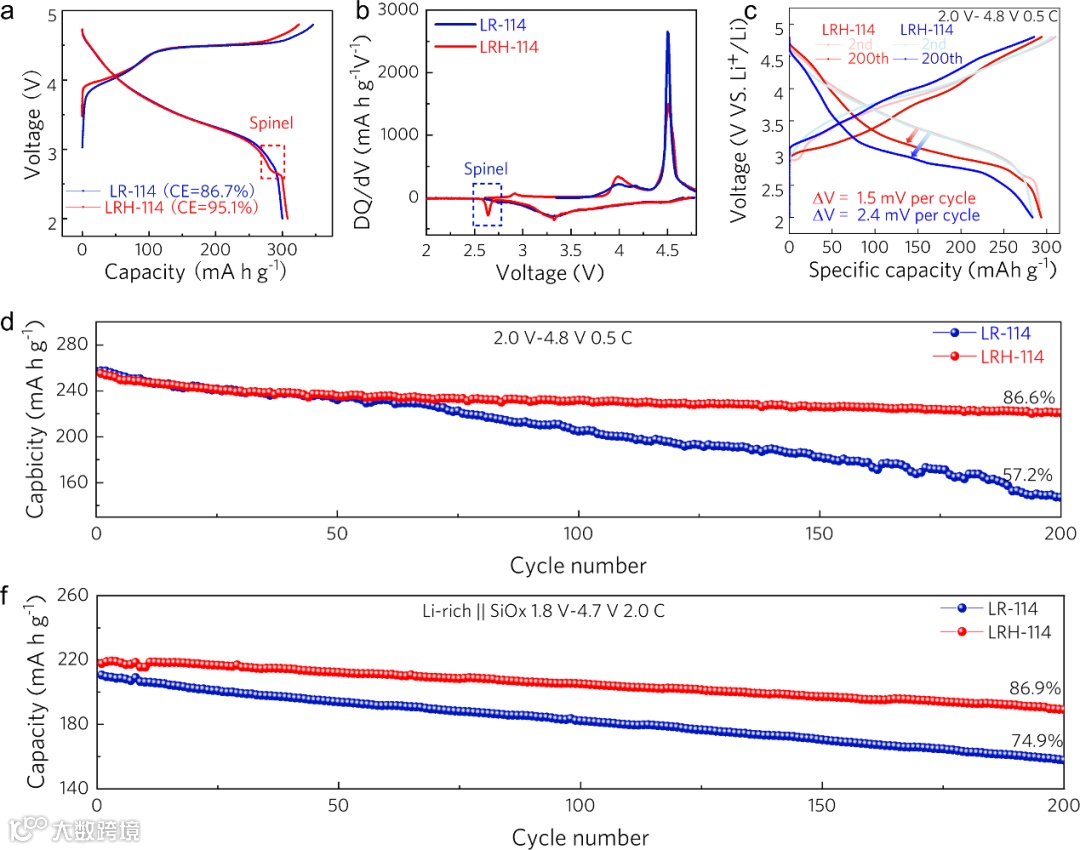 图3 a) 0.1 C (1 C = 250 mA g-1) 下初始循环的充放电曲线。c) LR-114和LRH-114在第2次和第200次循环时的归一化放电曲线。d) LR-114和LRH-114半电池在0.5 C时的循环性能在2-4.8 V范围内。e) LR-114和LRH-114全电池与SiOx阳极在2 C时的循环性能在1.8-4.7 V范围内。