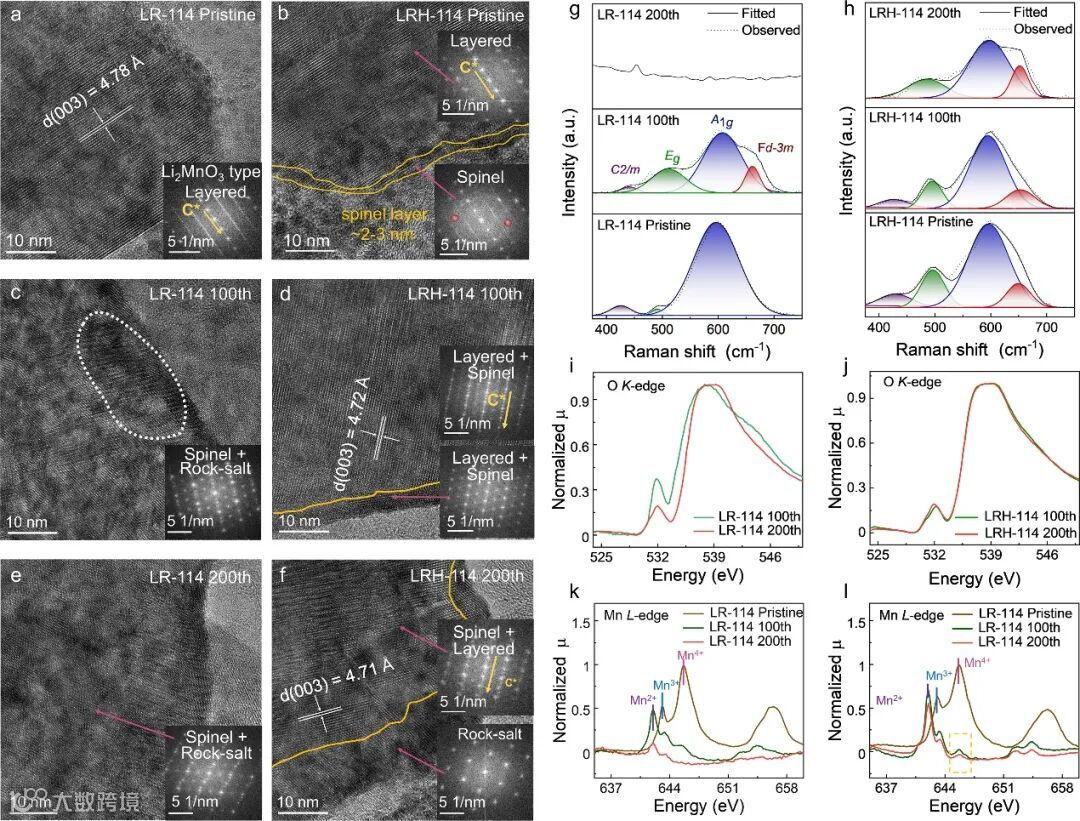 图4 LR-114和LRH-114在循环过程中的结构稳定性。原始LR-114(a)、100次循环后的LR-114(b)、200次循环后的LR-114(c)、原始LR-114(d)、100次循环后的LR-114(e)和200次循环后的LRH-114(f)的HRTEM图像。插图:相应区域的FFT图。LR-114(g)和LRH-114(h)在循环前、循环100次和200次后的拉曼谱。LR-114 (i) 和 LRH-114 (j) 在 TEY 模式下于 1 C 下循环 100 和 200 次后的 O K -edge sXAS 谱。在 TEY 模式下,LR-114 (k) 和 LRH-114 (l) 在 1 C 下循环前以及循环 100 和 200 次后的 Mn L-edge sXAS 图谱。