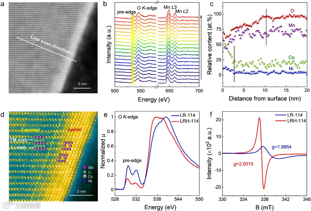 图1 a) LRH-114的ADF-STEM图像。b) LRH-114的STEM-EELS谱,沿着(a)中标记的箭头记录,从表面指向体相。c) O (红色)、Mn (紫色)、Co (绿色) 和 Ni (蓝色) 的相对含量与位置的函数关系,由 (b) 中相应 EELS 峰的积分强度得出。d) 红色虚线和黄色虚线之间的区域为致密化层。e) LR-114 和 LRH-114 在 TEY 模式下的 O K-edge sXAS 谱。