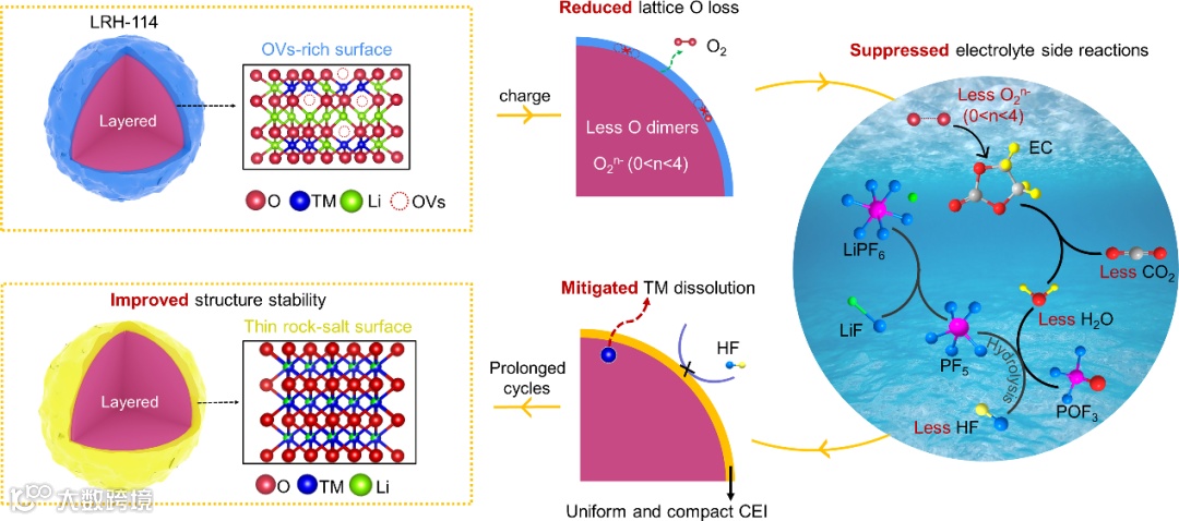 Scheme 1 富含OVs的表面在稳定界面和保护LROs体相结构方面的作用示意图。
