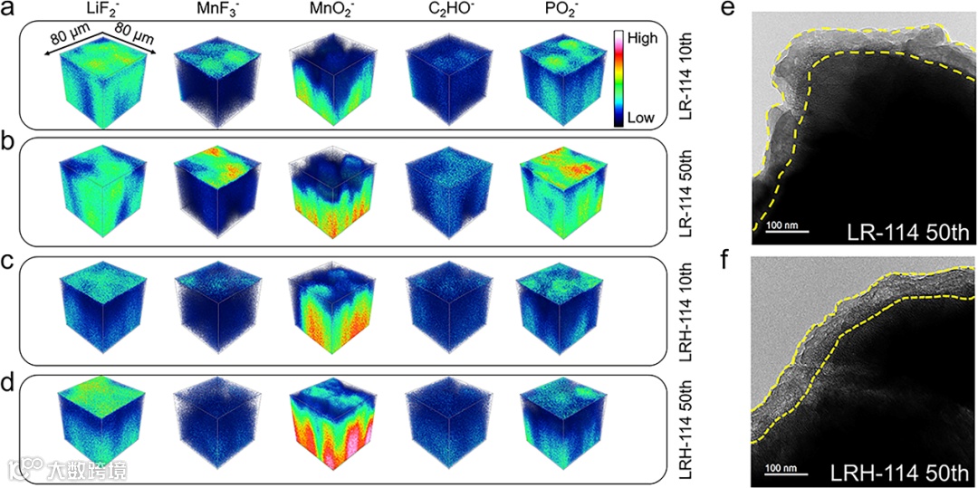 图5 由相应的TOF-SIMS结果得出的LR-114阴极在10次循环(a)和50次循环(b)后CEI层中LiF2-、MnF3-、MnO2-、C2HO-和PO2-信号的三维分布,以及LRH-114阴极在10次循环(c)和50次循环(d)后CEI层中LiF2-、MnF3-、MnO2-、C2HO-和PO2-信号的三维分布。50次循环后LR-114(e)和LRH-114(f)的Cryo-STEM图像。