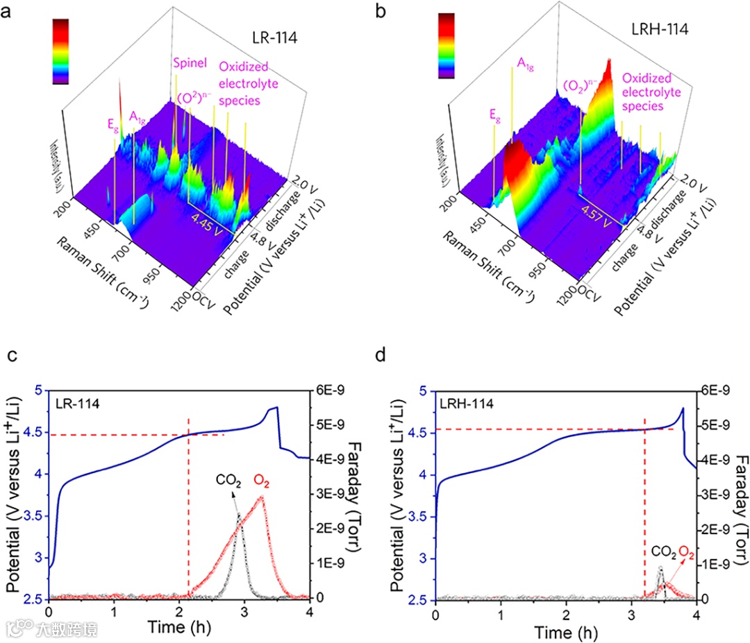 图2 a,b) LR-114 (a) 和 LRH-114 (b) 第一次充放电过程中的原位 SERS。c,d) LR-114(c)和LRH-114(d)的Operando DEMS结果以及相应的充放电曲线。