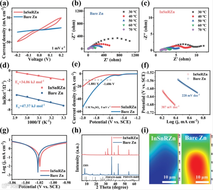 图5 a)bare Zn和InSnRZn负极的CV曲线。b)bare Zn和c)InSnRZn在不同温度下的电化学阻抗光谱。d)bare Zn和InSnRZn的Arrhenius曲线和锌沉积的活化能。e)bare Zn和InSnRZn的LSV曲线和f)Tafel斜率。g) bare Zn和InSnRZn的线性极化曲线。h) bare Zn和InSnRZn在水系电解质中浸泡5天后的XRD图谱。i)bare Zn 和InSnRn在水系电解质中浸泡后表面拉曼面扫。