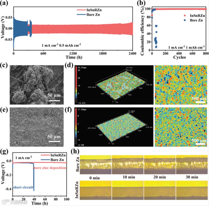 图3 a) Zn//Zn和InSnRZn//InSnRZn对称电池的电化学稳定性比较。b) bare Zn//Cu和InSnRZn//Cu电池中的Zn电镀/剥离CE。c) 电沉积后bare Zn的SEM图像和d) LCSM图像。e) 电沉积后InSnRZn的SEM图像和f) LCSM图像。g) bare Zn和InSnRZn的过镀测试。h) 不同电镀时间后bare Zn和InSnRZn的原位光学显微镜图像。