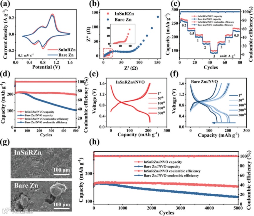 图6 a) InSnRZn/NVO和bare Zn/NVO电池的CV曲线。b) InSnRZn/NVO和裸Zn/NVO电池的EIS。c) InSnRZn/NVO和bare Zn/NVO电池的速率性能。d) InSnRZn/NVO和bare Zn/NVO电池在1 A g-1的长期循环性能。e)InSnRZn/NVO电池和f)bare Zn/NVO电池在不同循环下的电压-容量曲线。g)InSnRZn(顶部)和bare Zn(底部)在循环后的SEM照片。h)InSnRZn/NVO和bare Zn/NVO电池在5 A g-1时的长期循环性能。