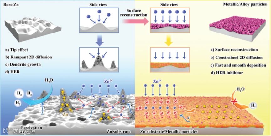 图1 裸露的锌负极(左)和金属颗粒重构的锌负极(右)表面的锌沉积过程示意图。