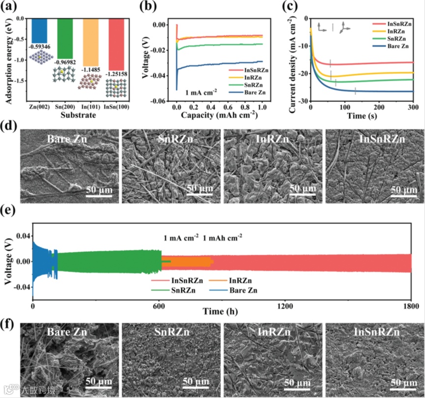 理论计算揭示了锌在铟锡合金表面吸附能更低,意味着与锌之间更强的相互作用。InSnRZn负极表面丰富的具有高亲和力的合金颗粒为均匀成核提供了丰富的位点。此外,锌在锡和铟基底上都显示出增强的吸附能,这表明从理论上讲,纯铟和锡也可以改善锌的电化学性能。因此,设计了带有锡和铟层的SnRZn和InRZn负极,以进一步验证金属颗粒的表面重构效应。表面重构锌负极展现出了更低的形核过电势,降低了形核能垒,提供了丰富的活性位点。金属颗粒和锌之间强的相互作用对锌离子扩散行为造成影响,抑制了猖獗的二维扩散,锌在表面直接形核生长,抑制锌聚集性不均匀沉积,有利于提高锌循环稳定性。循环后表面形貌对比也表明在金属颗粒作用下,锌沉积行为得到了明显改善。