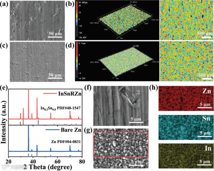 图2 a) 裸锌的SEM图像;b) 裸锌的LCSM图像;c) InSnRZn的SEM图像;d) InSnRZn的LCSM图像;e) 裸锌和InSnRZn的XRD图谱。f)裸锌和g)InSnRZn的高倍率SEM图像。h)InSnRZn的SEM元素分布图。