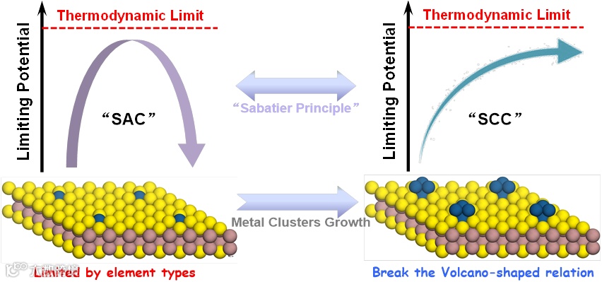 图1. 基于Sabatier法则提出因元素类型限制的火山型关系的解决方案和通过金属簇生长打破火山型关系的策略。