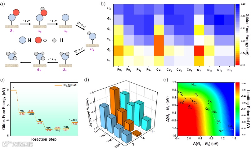 图3. NORR反应的途径(a)、72种关键中间体体系的Gn序列(b)、NORR在Co4@GaS上的吉布斯自由能变化曲线(c)、所有体系的极限电势(d),以及极限电势随两个最具决定性步骤变化的等值线图(e)。