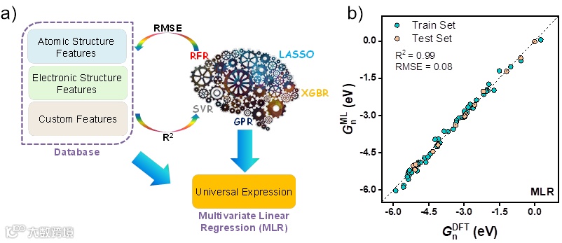 图5. 输入数据采集和ML进程示意图(a)、Gn的DFT计算值与MLR预测值的比较(b)。