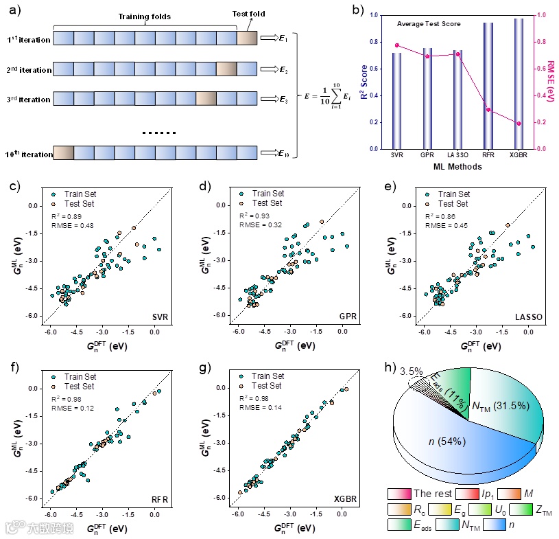 图4. 10倍交叉验证数据库分割策略举例(a)、不同ML模型测试集上R2和RMSE的平均得分(b)、Gn的DFT计算值与五种ML方法预测值的比较(c-g),以及特征重要性分析(h)。
