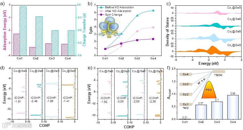 图6. NO分子在Co基体系上的吸附能和相应的电荷转移(a)、TM簇在NO吸附前后的自旋变化和Co4@GaS的自旋密度差图(b)、Co基体系的DOS分析(c)、TM簇与*NO/*NOH在Co基体系上的COHP分布(d-e),以及*NO与*NOH之间的ICOHP (ΔICOHP)差异(f)。