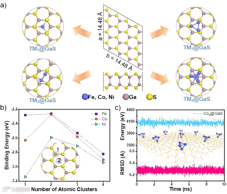 图2. TM1@GaS、TM2@GaS、TM3@GaS和TM4@GaS的原子构型(a)、所有体系中金属团簇结合能的计算值(b),以及Co4@GaS的MD模拟(c)。