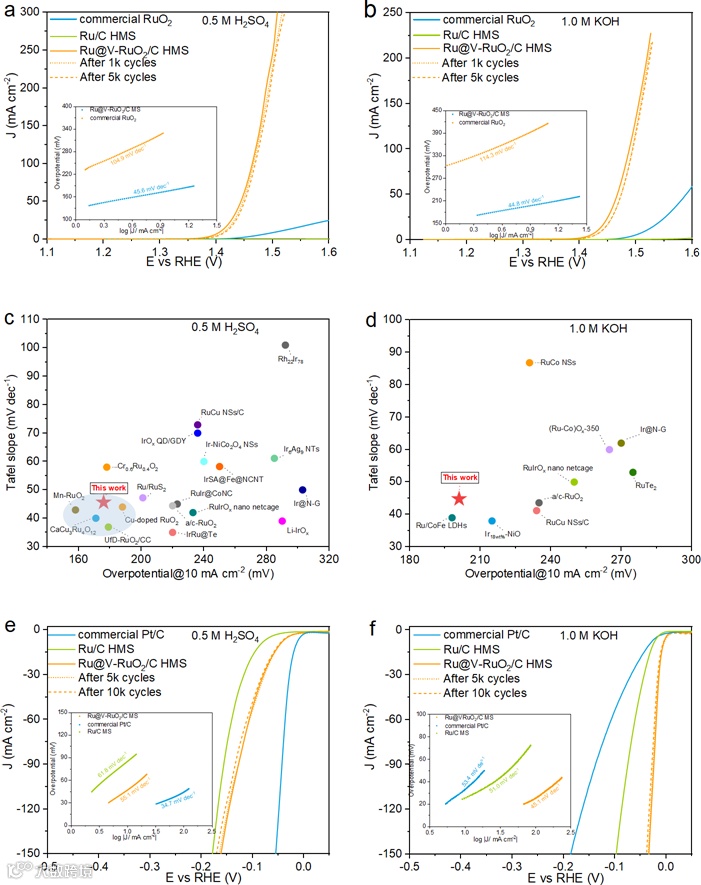 所制备的Ru@V-RuO2/C HMS集成了HER活性的Ru和OER活性的RuO2两种成分,因此期望表现出优越的电催化活性。结果如预期,所获得的材料在酸性和碱性溶液中均表现出优异的OER活性和循环稳定性,达到10 mA cm-2电流密度所需的过电位分别仅为176和201 mV。另外,该材料也呈现出良好的HER性能,在0.5 M H2SO4和1.0 M KOH分别仅需47和6 mV即可达到10 mA cm-2。密度泛函理论计算表明,将Ru修饰一层富含氧空位的RuO2皮肤可以改善界面电子结构,使氢中间体的吸附行为相比Ru(-0.31 eV)更接近中性(0.12 eV)而加快析氢动力学;同时能够减弱RuO2对氧中间体(*O)的吸附而降低氧释放的能垒,因此表现出双功能活性。