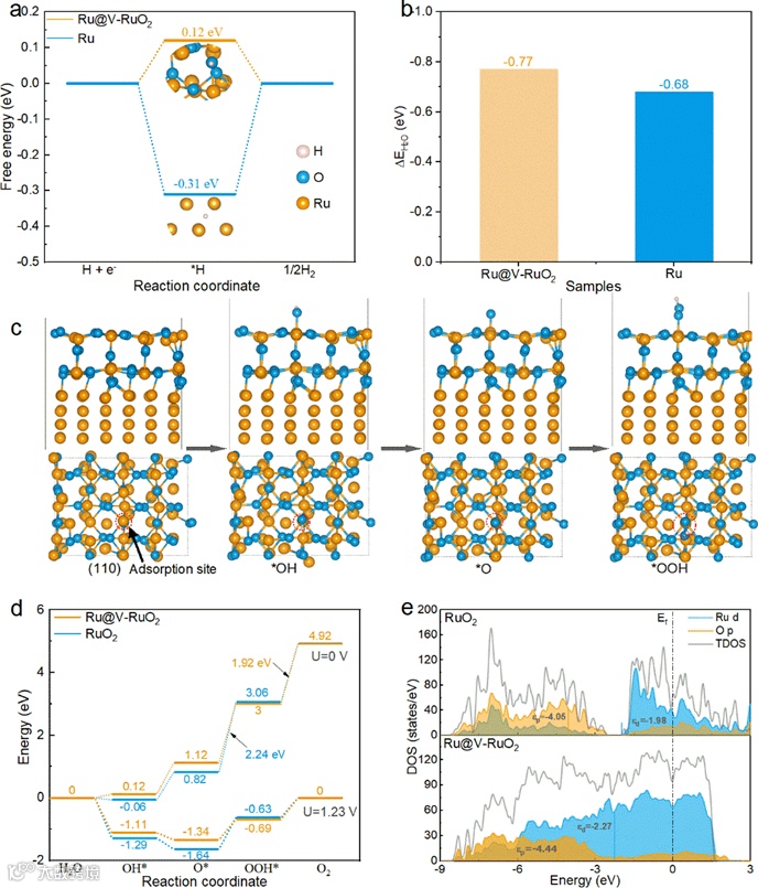 图5. Ru@V-RuO2用于HER和OER的理论分析。