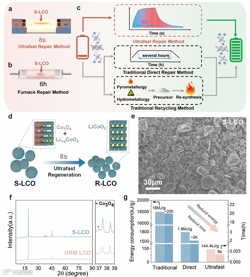 图1. (a) 超快修复过程和 (b) 熔炉修复方法的示意图;(c) 再生过程示意图;(d) S-LCO修复过程示意图;(e) S-LCO的SEM图;(f) S-LCO 和 URM-LCO 的 XRD 图;(g) 不同再生过程的能耗和运行时间。