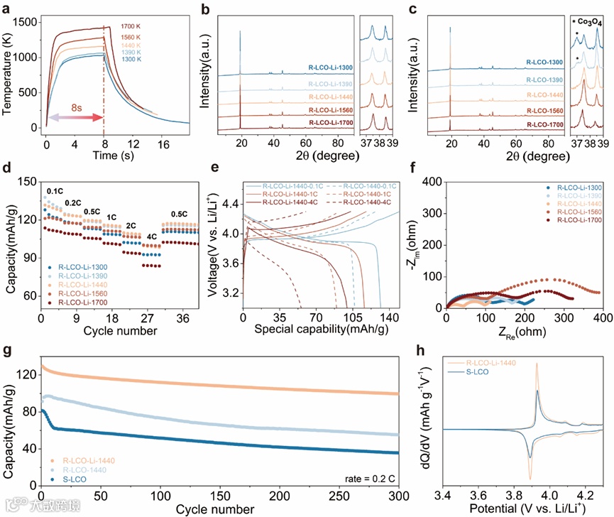 图3. (a) 实验过程中的温度变化;(b) 不同温度下以Li2CO3为锂源的R-LCO的XRD图谱;(c) 不同温度下无锂源再生LiCO2的XRD图谱;(d) 以Li2CO3为锂源的R-LCO在不同温度下的倍率性能;(e) R-LCO-Li-1440(实线)和R-LCO-1440(虚线)在不同电流下的充放电曲线;(f) R-LCO-Li-T的EIS曲线;(g) S-LCO、R-LCO-Li-1440 和 R-LCO-Li-1440 在 0.2 C 下的循环性能;(h) S-LCO和R-LCO-Li-1440的dQ/dV曲线。