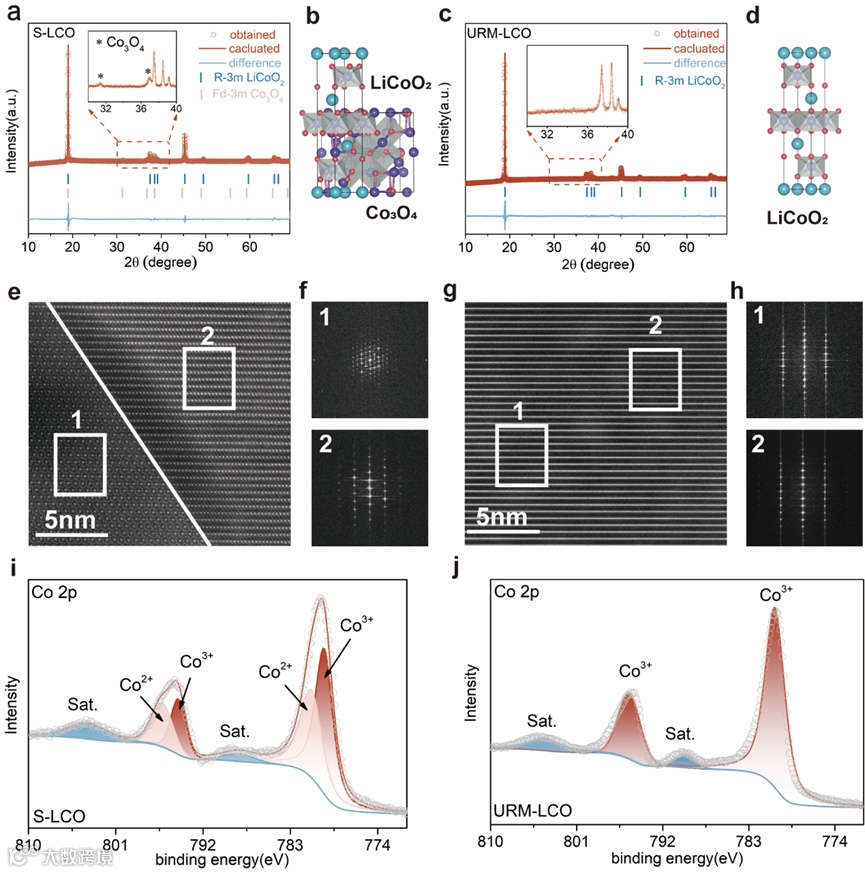 图2中研究者对修复前后正极材料的结构表征发现由于长时间的电化学循环正极材料的结构发生改变,部分形成了尖晶石相的Co3O4。而通过超快修复法之后得到的正极材料则完全恢复为完美的层状结构。