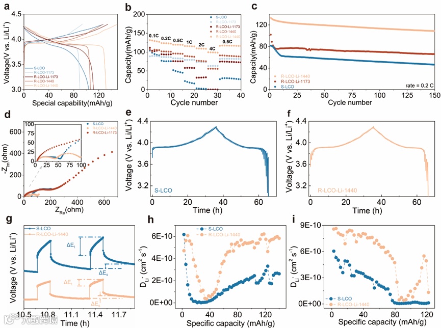 图 4. (a) S-LCO、R-LCO-1173、R-LCO-Li-1173、R-LCO-1440 和 R-LCO-Li-1440 的充放电曲线;(b) 不同样品的倍率性能;(c) S-LCO、R-LCO-Li-1173 和 R-LCO-Li-1440 的长期性能;(d) S-LCO、R-LCO-Li-1173和R-LCO-Li-1440的EIS曲线;(e) S-LCO 和 (f) R-CO-Li-1440 的 GITT 曲线随时间的变化;(g) S-LCO和R-LCO-Li-1440充电时的GITT曲线;(h) 充电和 (i) 放电的 Li+(DLi+) 的化学扩散系数。