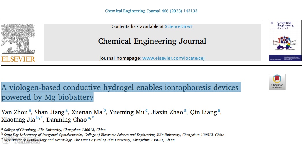 近日,来自吉林大学的贾晓腾副教授和晁单明教授团队,在国际知名期刊 Chemical engineering journal 上发表题为“A viologen-based conductive hydrogel enables iontophoresis devices powered by Mg biobattery”的文章,该文章将新型导电紫精水凝胶材料作为人机交互界面材料,与生物组织之间具有较高的稳定性、界面黏附性和共形。