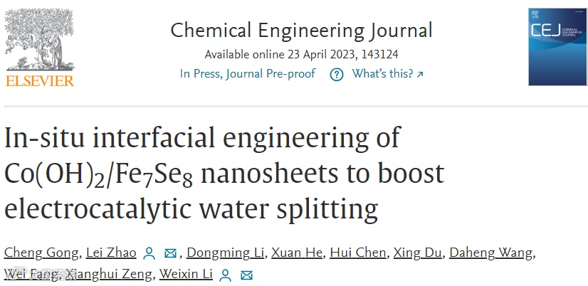 基于此,武汉科技大学赵雷教授、李薇馨副教授,在国际知名期刊Chemical Engineer Journal上发表题为“In-situ interfacial engineering of Co(OH)2/Fe7Se8 nanosheets to boost electrocatalytic water splitting”的研究文章。武汉科技大学材料与冶金学院硕士研究生龚诚是论文第一作者。