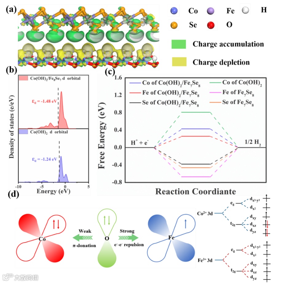 图2. (a) Co(OH)2/Fe7Se8的差分电荷密度图;(b)Co(OH)2/Fe7Se8和Co(OH)2的d轨道中心;(c)不同催化剂计算的H*吉布斯自由能;(d)Co-O-Fe模型示意图。