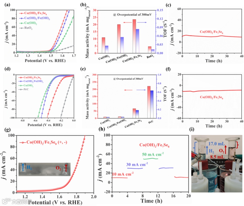 图3.(a)LSV曲线(OER);(b)Co(OH)2/Fe7Se8、Co(OH)2/Fe(OH)3、Co(OH)2和RuO2对HER的过电位(10 mA cm-2)、质量活性和TOF值;(c)稳定性测试(OER);(d)LSV曲线(HER); (e)Co(OH)2/Fe7Se8、Co(OH)2/Fe(OH)3、Co(OH)2和Pt/C对HER的过电位(10 mA cm-2)、质量活性和TOF值;(f)稳定性测试(HER);(g)全解水中的LSV曲线;(h)稳定性测试;(i)Co(OH)2/Fe7Se8催化剂的双电极全解水气体收集装置。