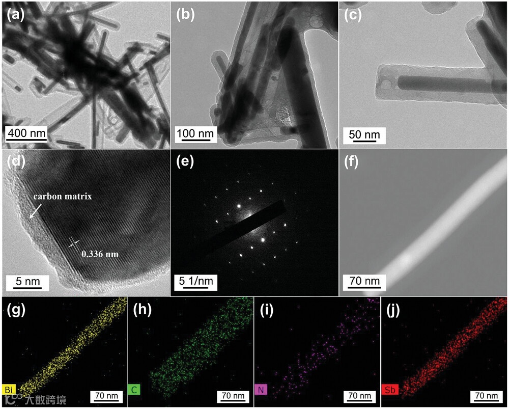 图二:Sb0.25Bi0.75@NC复合材料(a-c)在不同放大倍数下的TEM图像(d)高分辨TEM图像(e)选区电子衍射花样(f)暗场像(g-j)EDX能谱