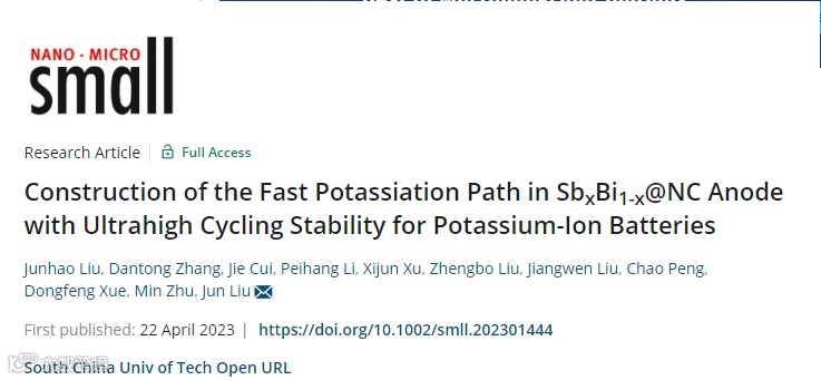 基于此,来自华工的刘军教授与深研院的薛冬峰教授合作,在国际知名期刊Small上发表题为“Construction of the Fast Potassiation Path in SbxBi1-x@NC Anode with Ultrahigh Cycling Stability for Potassium-Ion Batteries”的文章。
