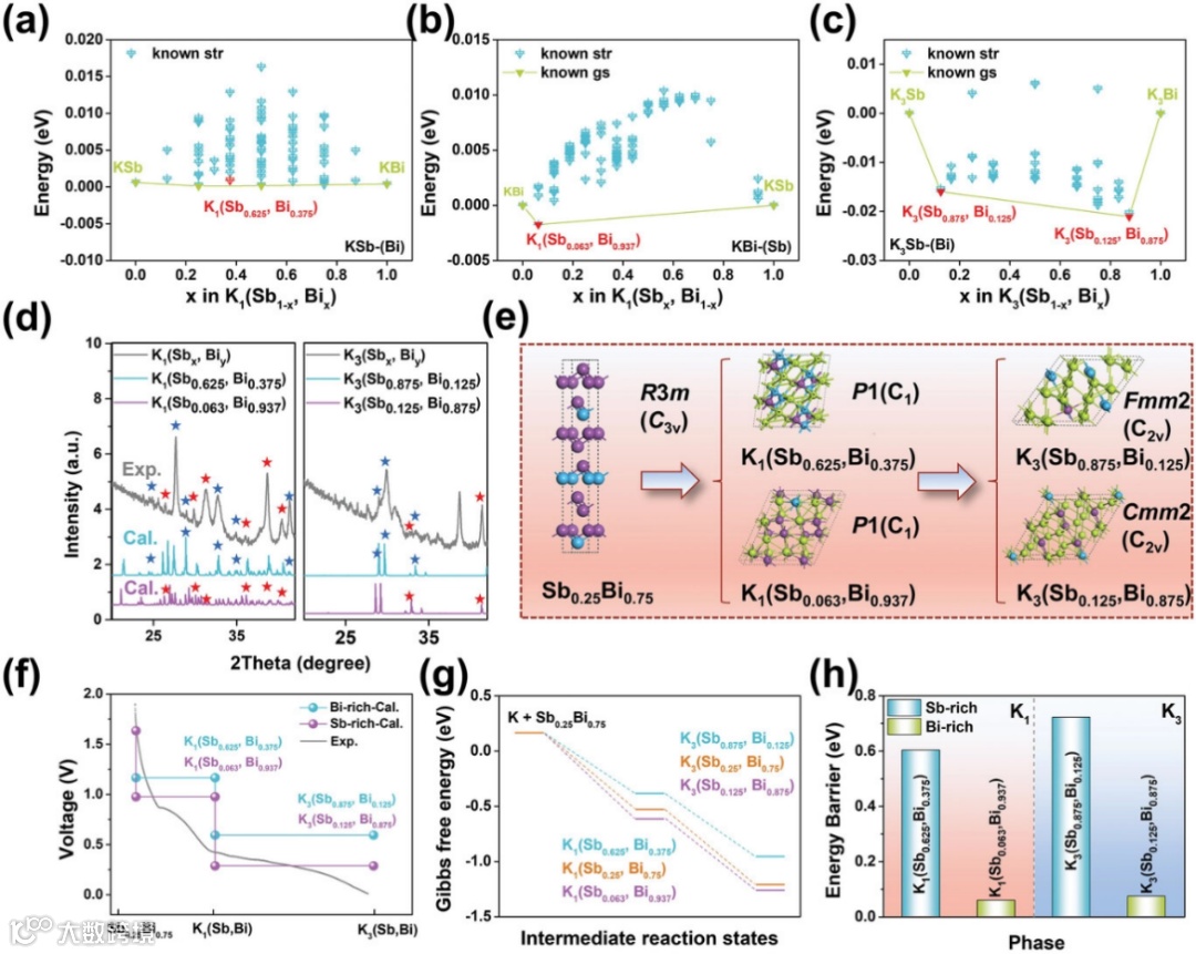 图四:(a-c)通过DFT计算得到的K1(Sb, Bi)、K3(Sb, Bi)样品的最低能垒(d)为K1SbxBi1-x和K3SbxBi1-x通过实验和理论建模得到的XRD谱(e)放电过程中的相变(f)实际和理论Sb0.25Bi0.75电压曲线(g)放电过程中的吉布斯自由能图遵循富Sb路径和富Bi路径(h)K1相和K3相的离子扩散能垒。