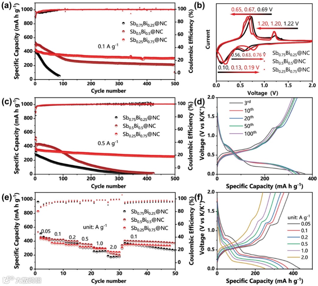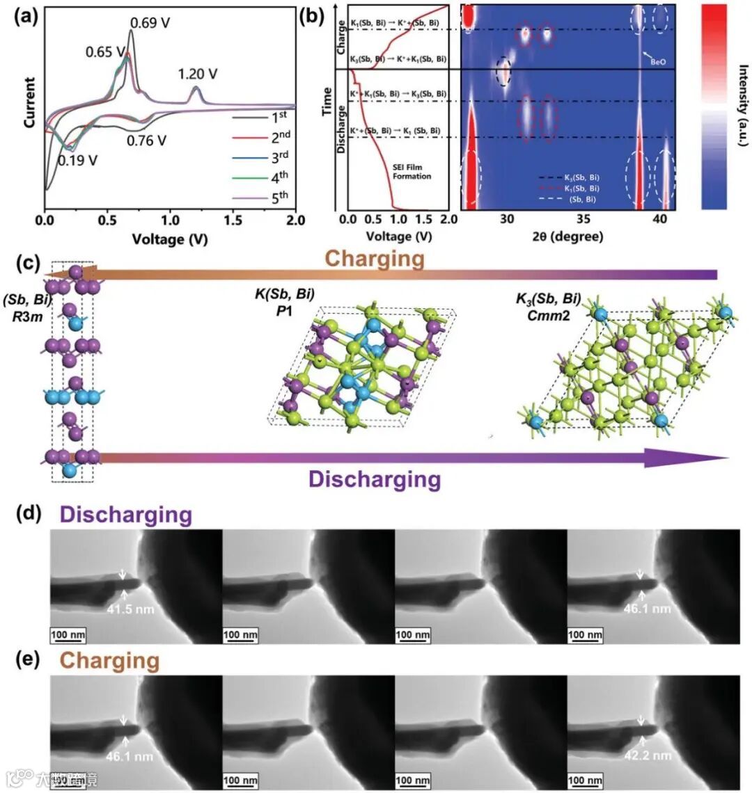 由于锂资源的稀缺,钾离子电池因其与锂离子电池相似的电化学性能以及钾资源更为丰富的储量,低廉的价格而受到广泛关注。然而,尽管(Sb,Bi)合金用于锂离子电池和钾离子电池负极的研究取得了卓越的进展,但大多数研究仅仅集中在形貌/结构的调整上,却忽视了充放电过程机理的表征以及合金成分对电化学性能影响。