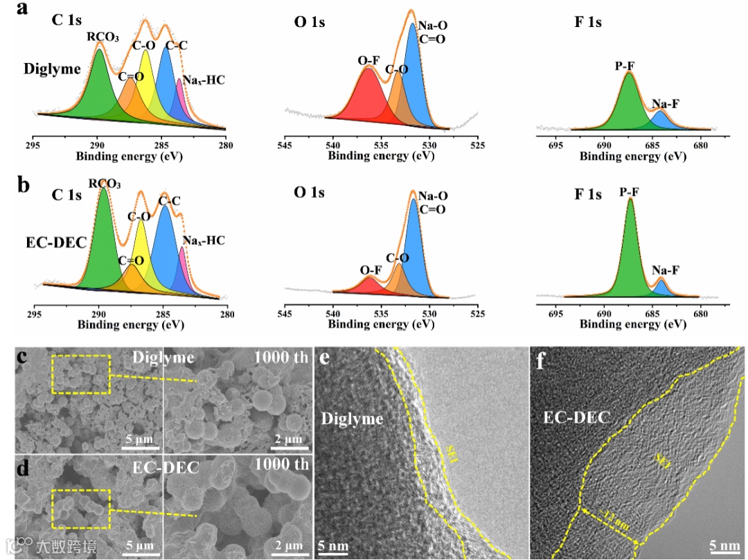 图5 (a)硬碳负极在Diglyme循环后的XPS谱图。(b)硬碳负极在EC-DEC循环后的XPS 谱图。(c)在 Diglyme 中循环 1000 次后电极的SEM图。(d)在 EC-DEC中循环1000次后电极的 SEM图。(f)在Diglyme和EC-DEC中循环1000次后电极的SEM图