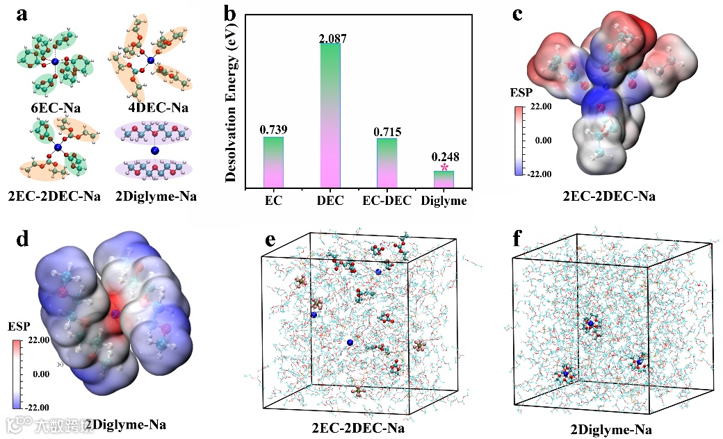 图2. (a) Na+和6个EC,4个DEC,2个EC-2 DEC和2个Diglyme分子的溶剂化结构。(b)脱溶剂化能。(c)计算1M NaPF6 EC-DEC的ESP。(d)计算1M NaPF6的ESP。(e)1M NaPF6 EC-DEC的快照图。(f)1M NaPF6的快照图。