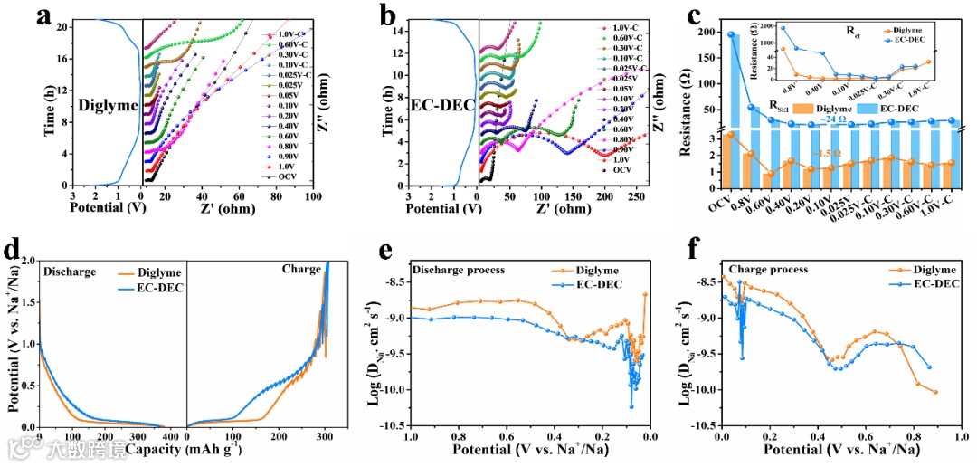 图4. PRHC-1300在Diglyme(a)和EC-DEC(b)中的原位EIS曲线。(c)EC-DEC和Diglyme电解液循环过程中RSEI和Rct的演变。(d)GITT曲线。(f)Na+表观扩散系数。