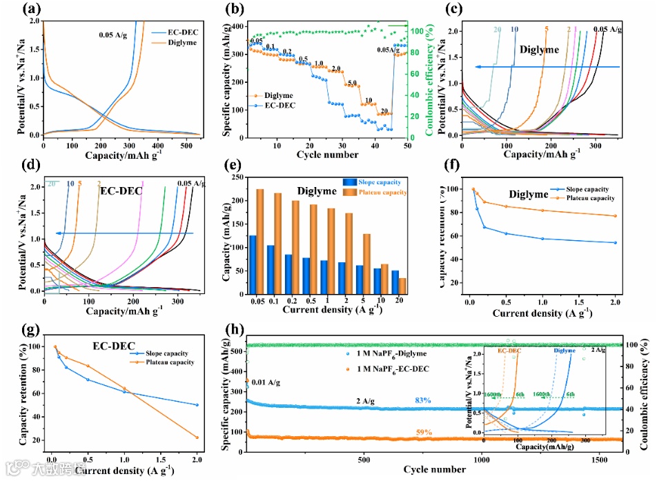 当电流密度从0.05到 20 A g-1时,酯体系EC-DEC中倍率容量从323.7降到123.3 mAh g-1,其容量损失比醚体系高得多(Diglyme,倍率容量从351降到240.8 mAh g-1)。充放电曲线还表明在高电流密度下EC-DEC电解液中的电压极化远比Diglyme电解液中的要严重,导致了更大的容量衰减和差的倍率性能。由此可见,钠离子在Diglyme电解液中的扩散速度要比在EC-DEC电解液中快很多,从而抑制了极化所引起的容量损失,使硬碳负极材料表现出优异的倍率性能。