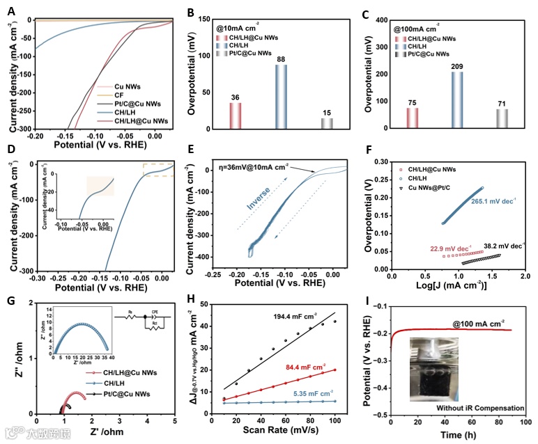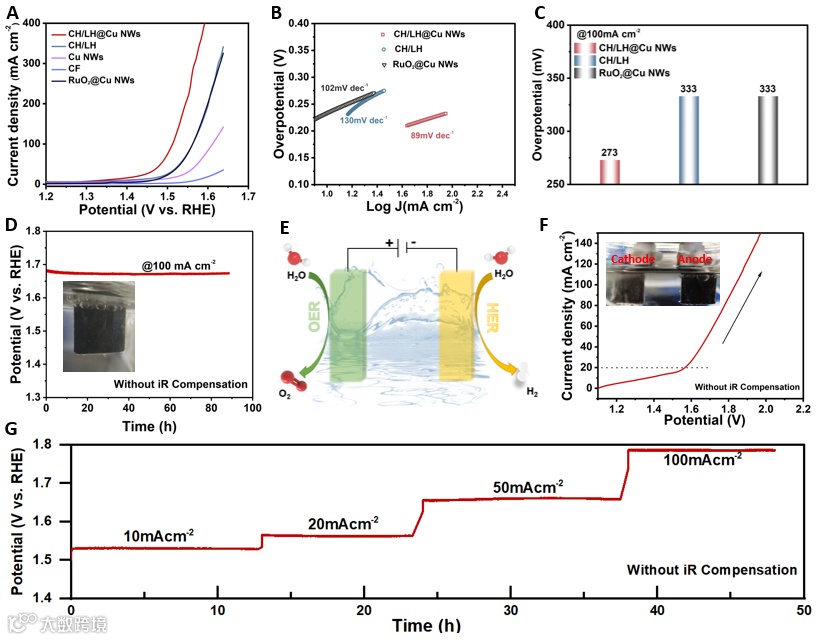 CH/LH@Cu NWs表现出优越的HER性能,在10 mA cm−2电流密度下的过电位为36 mV,其Tafel斜率为22.9 mV dec−1;此外,CH / LH@Cu NWs显示了非凡的碱性OER性能,在100 mA cm−2电流密度下的过电位为273 mV。这归因于CH/LH@Cu NWs异质结构中大量的纳米级界面和孔隙所导致的强烈电荷转移。