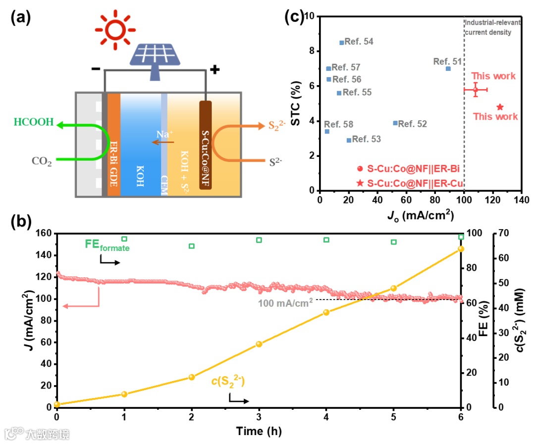 图4 (a)太阳能驱动CO2RR-SOR配对电解的PV-EC系统示意图;(b)太阳能驱动CO2RR-SOR电解的电流密度-时间曲线,HCOO-产物的法拉第效率以及S22−物种累积浓度;(c)本文PV-EC器件性能与文献中CO2RR电解采用硅基光伏电池的PV-EC器件性能的比较。