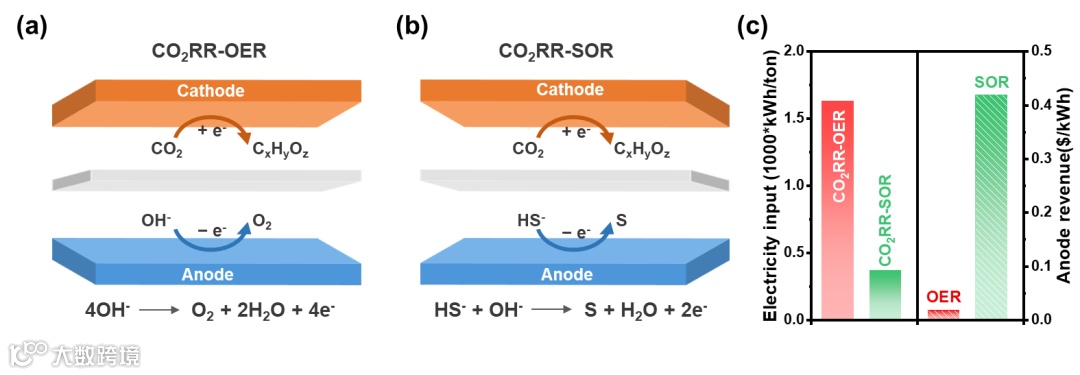 图1 (a)CO2RR+OER和(b)CO2RR+SOR共电解系统示意图;(c)基于甲酸生产来对比两个配对电解系统的单位产量所需输入能耗(左)和阳极产物产出效益(右)。