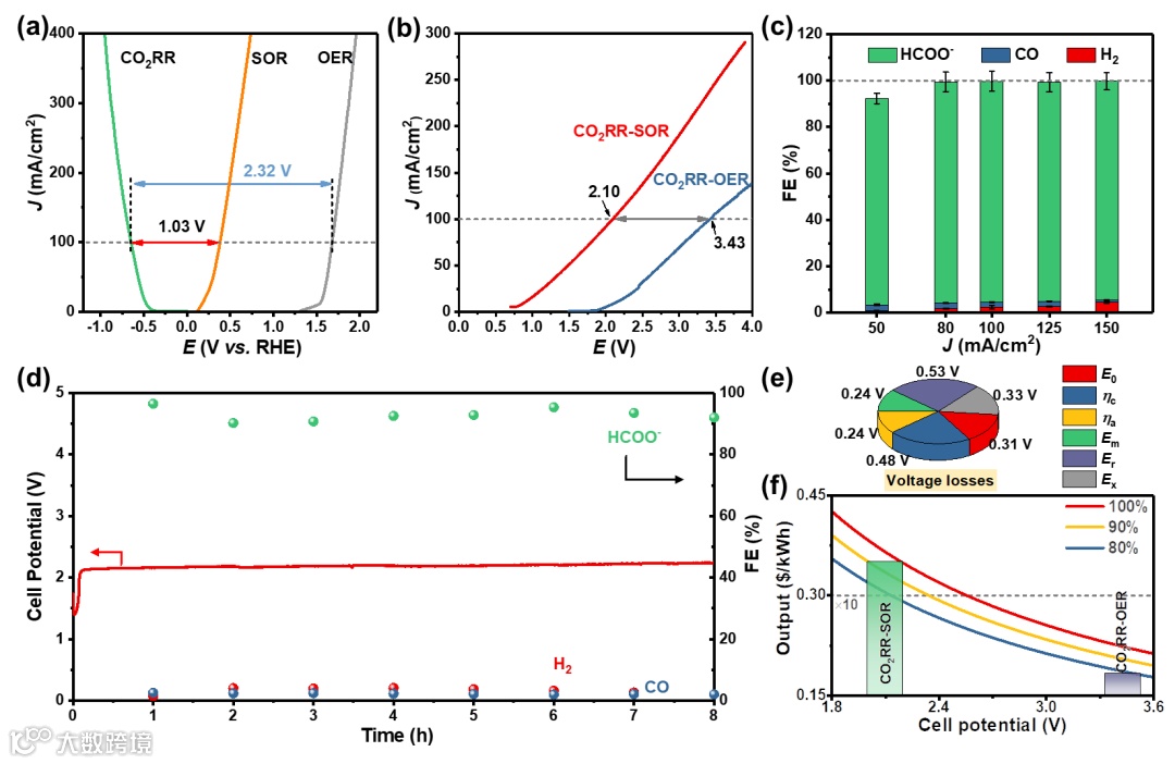 将S-Cu:Co@NF阳极与Bi基气体扩散电极(ER-Bi GDE)阴极配对构建CO2RR-SOR共电解体系,相比传统CO2RR-OER电解槽可节省40%的能耗要求。该共电解槽可在100 mA/cm2持续产出甲酸,保持槽压稳定在2.1 V,甲酸法拉第效率保持高于90%。电解电压能耗分析表明阴极过电位以及电解槽内阻导致的电位降消耗了大部分能量输入;技术经济分析表明CO2RR-SOR共电解可实现电解产出相比CO2RR-OER提高一倍。