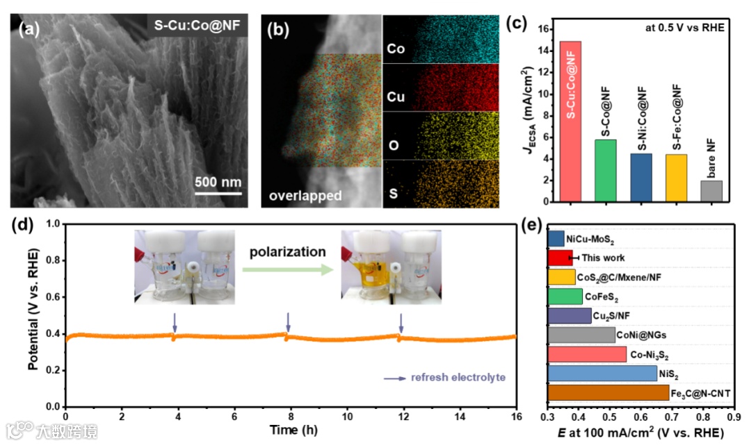 图2 S-Cu:Co@NF阳极催化剂形貌及其SOR催化表现。(a)扫描电镜形貌图,(b)元素分布图,(c)0.5 V vs RHE电极电位下ECSA归一化电流密度,(d)100 mA/cm2恒电流极化稳定性测试,(e)达到100 mA/cm2时S-Cu:Co@NF电极与文献报道SOR电极所需施加电压比较。